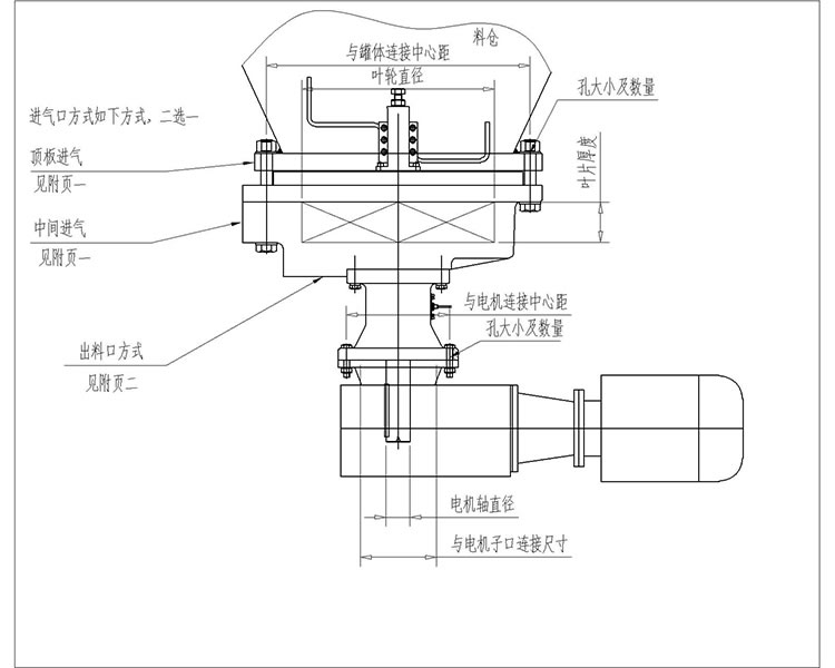 1、先將給料機(jī)與料倉用螺栓連接緊固,中間需有密封墊(圈),保持密封,再將進(jìn)氣口和出料口分別與外部的管路相連接;給料機(jī)軸承座上有三處接口,分別為平衡孔、吹掃孔、注油孔,平衡孔與吹掃孔連接一路氣源,注油孔每三個(gè)月加注一次黃油。三處接口在不同的給料機(jī)軸承座上的位置不同,請現(xiàn)場查看指示牌。